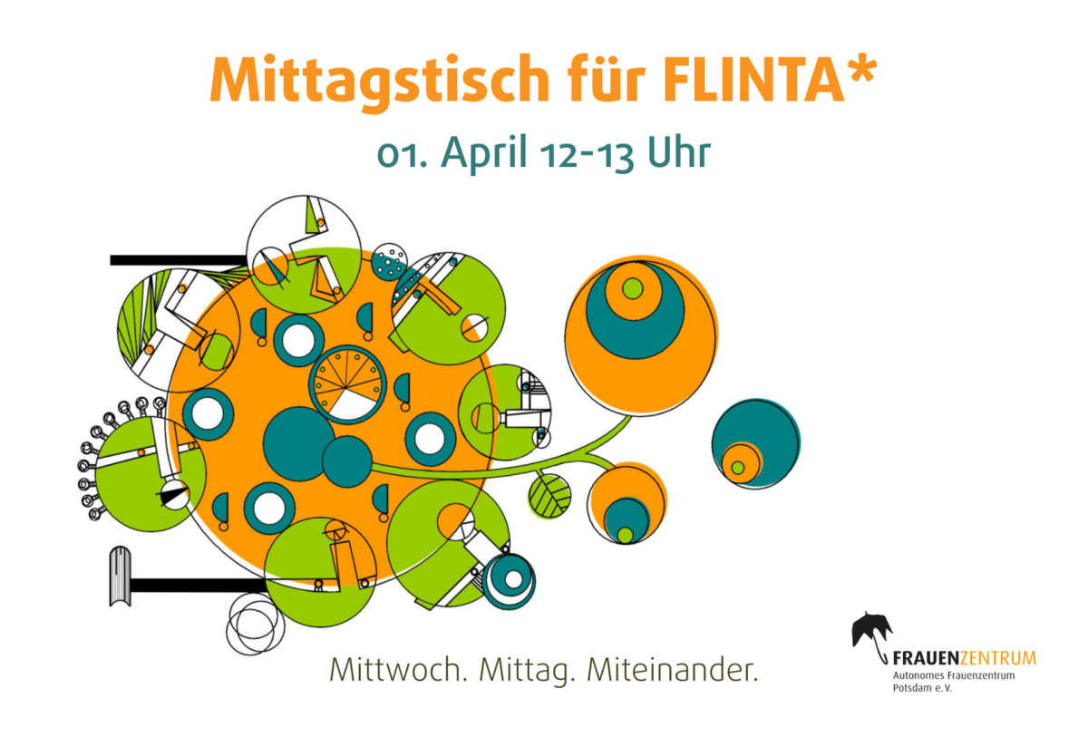 Das Autonome Frauenzentrum Potsdam lädt ab April jeden ersten Mittwoch im Monat von 12-13 Uhr zum Mittagstisch für FLINTA* in den *innenRaum ein. Hier könnt ihr andere FLINTA*-Personen treffen und in eurer Pause kurz auf andere Gedanken kommen, bevor ihr wieder in den Alltag zurückkehrt.
