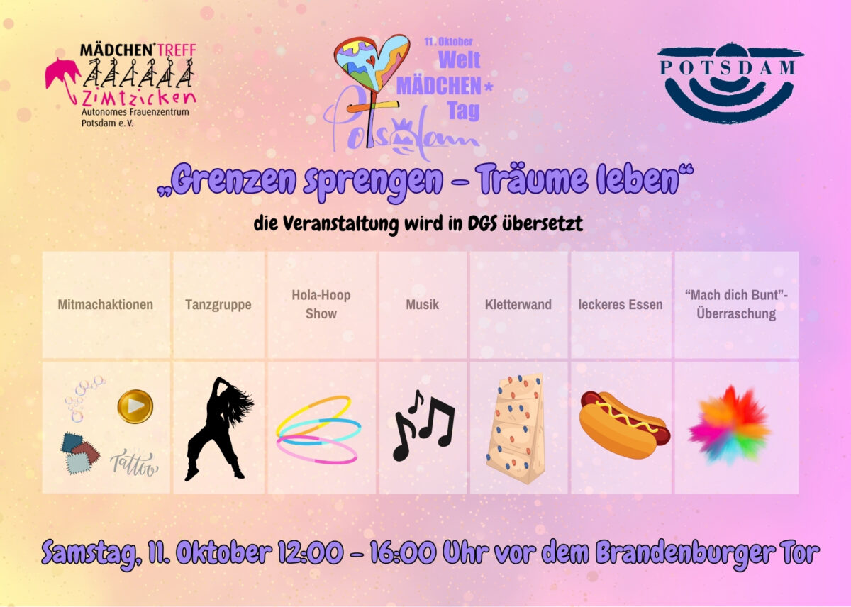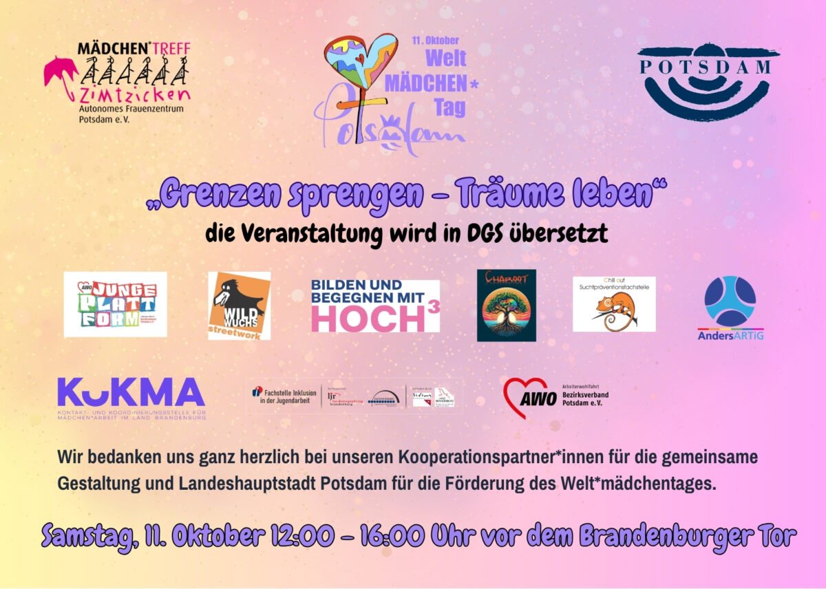 Mädchen* aufgepasst: Unter dem Motto „Grenzen sprengen – Träume leben“ begeht Potsdam den diesjährigen Weltmädchen*tag. Der Mädchen*treff Zimtzicken und die Landeshauptstadt Potsdam haben mit vielen engagierten Kooperationspartner*innen ein tolles Programm auf die Beine gestellt. Kommt hin, bringt eure Freundinnen mit und genießt einen wunderbaren Samstag.